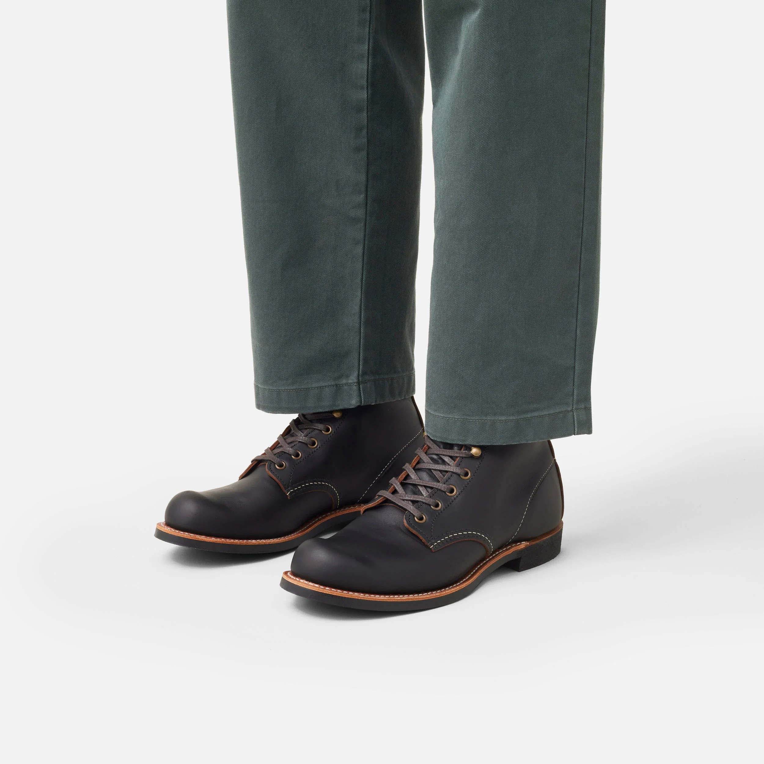 The Red Wing Shoes Blacksmith 3345 Black Prairie is a classic Red Wing Shoes 6-inch Round work shoe and is made in Red Wing, Minnesota. The Red Wing Blacksmith dates back to the founding years of the Red Wing Shoe company. During the 1900s the Red Wing Blacksmith style became popular amongst workers. The Red Wing 3345 Blacksmith is made from Black Prairie leather. The Black Prairie leather of the 3345 Blacksmith is double-tanned and features a brown core and a black exterior. They age beautifully and end up having a deep brown colour. The Red Wing 3345 Blacksmith Black Prairie has a black Vibram 430 Mini lug sole and comes with black waxed flat laces.